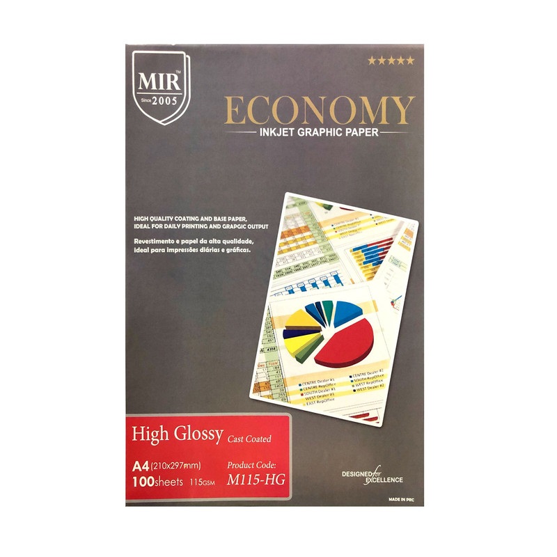 كاغذ 115گرم گلاسه 100 برگ سايز A4 مارک MIR با کیفیت مناسب برای چاپ کاور و عکس روی جلد با قیمیتی ارزان برای پرینتر های جوهر افشان