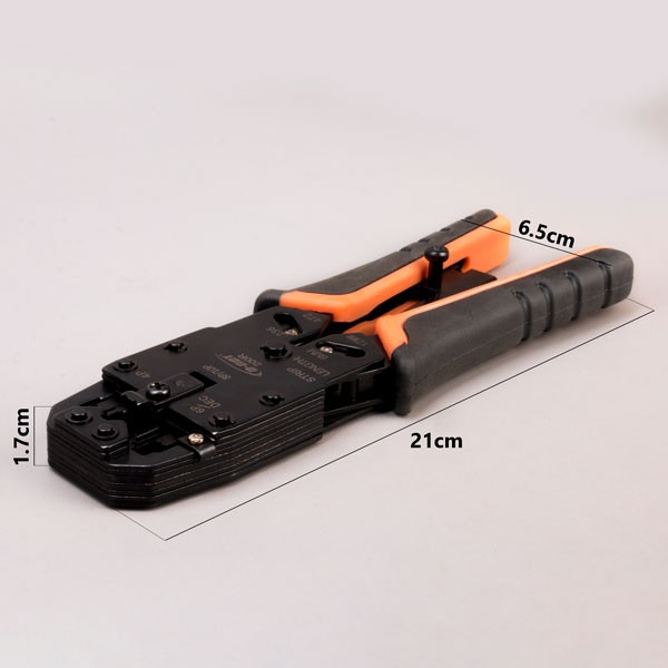 این محصول در ابعاد 17×60×205 میلی متر و وزن 550 گرم قابلیت پرس سوکت های بند خط و بند گوشی و شبکه را دارد. همچنین این آچار دارای قسمت سیم لخت کن می باشد که با استفاده از سیم لخت کن روی دسته این آچار میتوانید به راحتی سیمها و کابلهای گرد و تخت را لخت یا قطع کنید.