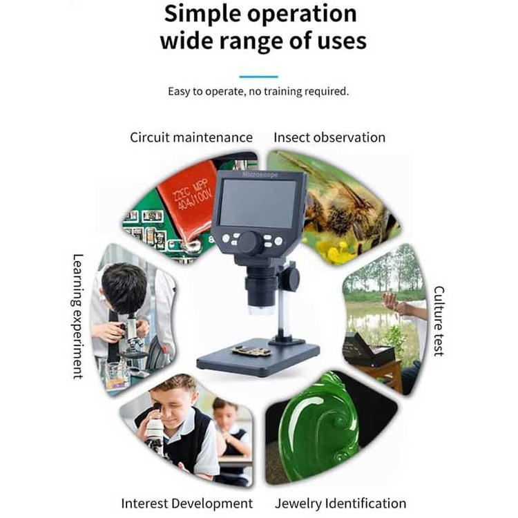 میکروسکوپ دیجیتال مدل NETPIL G1000 یک میکروسکوپ دیجیتال با زوم پیوسته است و دارای طیف وسیعی از مشاهدات بوده و از 1 تا بزرگنمایی 1000 برابر داشته و می توانید یک مضرب مناسب برای دیدن جسم پیدا کنید. ویدئو ضبط شده را می توان در کارت حافظه فلش ذخیره کرد ، فاصله جسم حداقل 10 میلی متر بوده و تا فاصله های مختلف جسم با مضرب های مختلف مطابقت دارد ، با باتری لیتیومی که می تواند به طور مداوم برای 4-6 ساعت کار کند. برای طیف گسترده ای از صنایع مناسب است از فبیل بازرسی QC از انواع مختلف کارخانه ها، آموزش کمک برای موضوعات مختلف، مشاهده پوست و مو، پرورش علایق و سرگرمی های کودکان، شناسایی جواهرات و الماس، PCB، سخت افزار دقیق، زیست شناسی، مواد معدنی، چاپ، پارچه، عتیقه و غیره . این محصول در مشکل انعکاس زیاد بهبود یافته است، این یک میکروسکوپ دیجیتال است که می تواند زاویه را تنظیم کند و مجهز به 8 مهره لامپ LED روشن است.پایه متحرک میکروسکوپ از پلاستیک و فلز با کیفیت بالا ساخته شده است که عمر طولانی دارد.