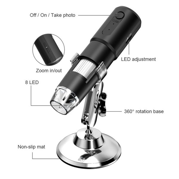 میکروسکوپ دیجیتال مدل INSKAM 314 قادر است از طریق وای فای به تلفن های هوشمند و تبلت وصل شود. بدون نیاز به کابل میتوان از آن به صورت دستی و یا با پایه متغییر و قابل انعطاف استفاده کرد. این میکروسکوپ با سیستم عامل های IOS، Andriod، Windows و Mac OS کار میکند. این میکروسکوپ دارای یک دوربین 2 مگا پیکسلی و رزولوشن 480 در 640 میباشد که میتواد تصاویر JPG با کیفیت بالا و فیلم های با فورمت MP4 , AV1 را ضبط و ذخیره کند. دوربین میکروسکوپ INSKSM 314 دارای حداکثر بزرگنمایی تا1000 برابر و کیفیت 1080P میباشد.