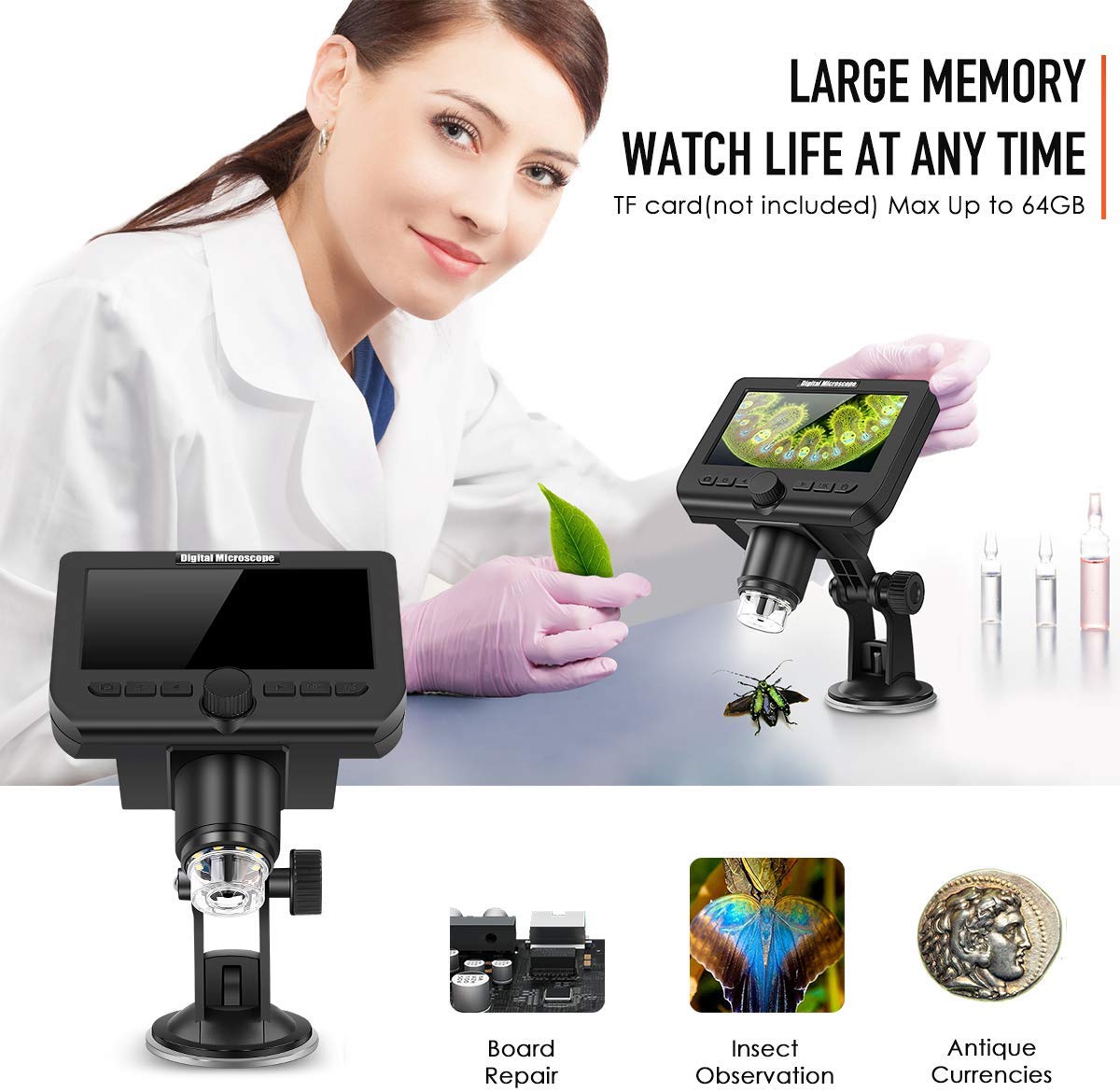 میکروسکوپ دیجیتال مدل G610 وای فای میکروسکوپ دیجیتال WiFi LCD 1080P صفحه 4.3 اینچی نمایش بزرگنمایی بی سیم VSATEN 50X-1000X بزرگنمایی USB دوربین میکروسکوپ 2 مگاپیکسی 8 ضبط کننده ویدیو دوربین LED برای آندروید ویندوز Mac Mac Linux میکروسکوپ با صفحه نمایش LCD کامل 4.3 اینچ LCD ch ماژول WiFi داخلی. شما می توانید تصویر و فیلم زنده HD را به صورت بی سیم در نمای وضوح تصویر 1080P / 720P / VGA بدون هیچ گونه تأخیر ببینید. آنها را در صفحه نمایش 4.3 اینچی LCD و تلفن / کامپیوتر / رایانه لوحی به طور همزمان مشاهده کنید. بزرگنمایی 50X-1000X می توانید آن را بزرگنمایی کنید تا با بزرگنمایی دکمه چرخشی دور ، بزرگنمایی مناسبی دریافت کنید. تمرکز دقیق خوب و درشت ، نمونه ها را به سرعت و به شدت نسبت به دیگران فوکوس می کند. Bat باتری لیتیوم داخلی 1800mAh ساخته شده بیش از 5 ساعت استفاده مداوم داشته باشید. 8 LED داخلی با تنظیم روشنایی ، به شما امکان می دهد سطح روشنایی مورد نظر را تنظیم کنید. مجهز به شکاف کارت میکرو TF. تصاویر و فیلم های به دست آمده در طول مشاهدات شما در یک کارت micro TF ذخیره می شوند و از 1-64 گیگابایت پشتیبانی می کنند .