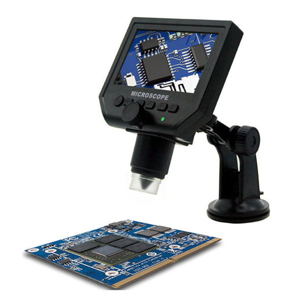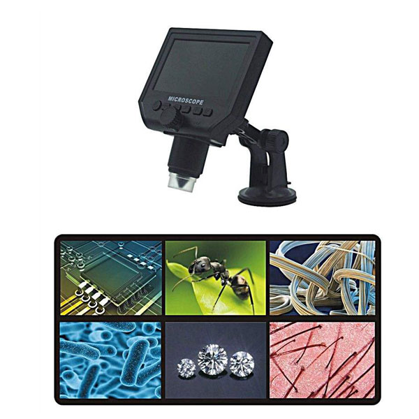 میکروسکوپ ال سی دی دیجیتالی مدل G600 میکروسکوپ دیجیتالی قابل حمل مدل G600 به کمک یک لنز حرفه ای و سنسور دوربین 3.6 مگاپیکسلی تصاویر شفاف از اجسام را به شما ارائه می دهد که از این تصاویر می توانید در کارت حافظه قابل اتصال به این میکروسکوپ، عکس برداری و فیلم برداری کنید.در بسته بندی اصلی این محصول دفترچه راهنمای انگلیسی، آداپتور استاندارد (بدون نیاز به مبدل مانند تصویر)، کابل یو اس بی و پایه نگهدارنده میکروسکوپ موجود می باشد نمایشگر 4.3 اینچی این لوپ الکترونیکی شما را از اتصال آن به کامپیوتر و سایر لوازم الکترونیکی بی نیاز می کند و به آن قابلیت جابجایی و استفاده در مکان های مختلف می بخشد. این نمایشگر قابلیت نمایش تصاویر با کیفیت 1080P/720P/VGA را ارائه می دهد. باتری قابل شارژ لیتومی این میکروسکوپ قابلیت کار بیشتر از 6 ساعت را دارد. هشت عدد ال ای دی تعبیه شده در زیر این لوپ الکترونیکی قابلیت مشاهده اجسام را در نور کم ممکن می سازد. صفحه نمایش 1.3 اینچی 4.3 اینچی و کنترل از راه دور بی سیم – صفحه نمایش داخلی 5 اینچی LCD برای مشاهده آسان زمینه دید گسترده ای را فراهم می کند. 2. عملکرد Muti- این میکروسکوپ دیجیتال LCD می تواند برای حیوانات و گیاهان ، مشاهده حشرات ، تشخیص یادگیری ، تمایز بین درست و نادرست ، شناسایی جواهرات ، تشخیص چاپ ، تعمیر برد مدار استفاده شود. 3. هدیه عالی – این بهترین هدیه برای کودکان ، دانش آموزان ، جمع آورندگان ، آزمایش کنندگان و هر کسی است که علاقه مند به کشف دنیای میکروسکوپی باشد. 4. Esay to use- برای تعمیر تلفن همراه ، بازرسی QC ، بازرسی از اهداف آموزشی ، بازرسی صنعتی ، صنعت چاپ ، مجموعه جواهرات ، صنایع نساجی و بازرسی بیولوژیکی.