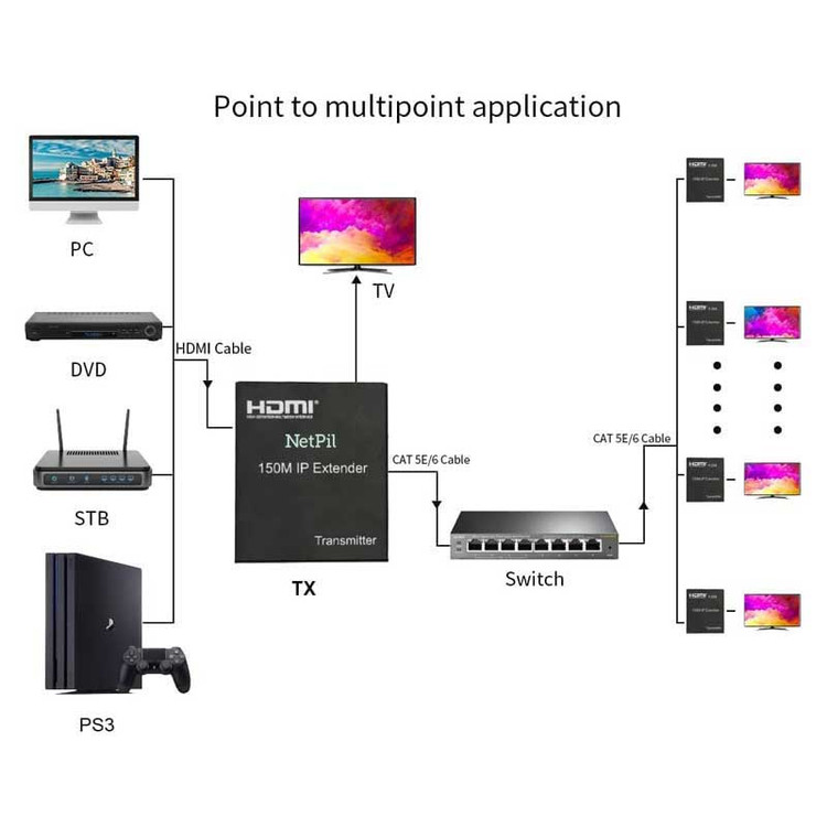 اکستندر HDMI نت پیل مدل EXB150 می تواند اتصال HDMI صوتی/تصویری را تا 150متر از طریق کابل cat5e/6 بین منبع ویدیو و HDTV، مانیتور یا پروژکتور گسترش دهد. توسعه دهنده HDMI با سیستم تنظیم خودکار داخلی و سیستم حفاظتی ESD. سازگار با تجهیزات سازگار با HDCP مانند رایانه شخصی / پخش کننده بلوری / تلویزیون / پروژکتور و غیره میباشد. سیگنال غیر فشرده برای تاخیر صفر و سیگنال HDMI Full HD 1080P@60Hz را بدون تاخیر و تلفات انتقال میدهد. برای عملکرد بهتر، استفاده از کابل اترنت مسی جامد (cat5e/6) را پیشنهاد میشود.
