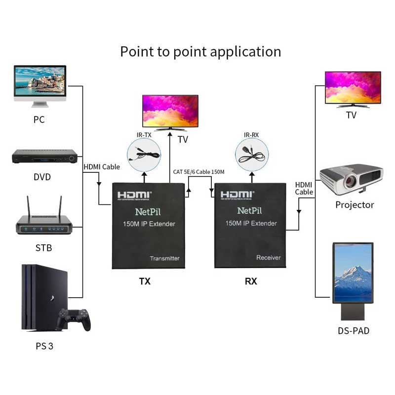 اکستندر HDMI نت پیل مدل EXB150 می تواند اتصال HDMI صوتی/تصویری را تا 150متر از طریق کابل cat5e/6 بین منبع ویدیو و HDTV، مانیتور یا پروژکتور گسترش دهد. توسعه دهنده HDMI با سیستم تنظیم خودکار داخلی و سیستم حفاظتی ESD. سازگار با تجهیزات سازگار با HDCP مانند رایانه شخصی / پخش کننده بلوری / تلویزیون / پروژکتور و غیره میباشد. سیگنال غیر فشرده برای تاخیر صفر و سیگنال HDMI Full HD 1080P@60Hz را بدون تاخیر و تلفات انتقال میدهد. برای عملکرد بهتر، استفاده از کابل اترنت مسی جامد (cat5e/6) را پیشنهاد میشود.