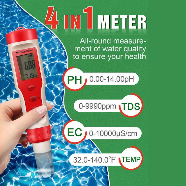 با PH متر مدل NETPIL EZ9908 R قادر خواهید بود تا محدوده مناسبی برای اندازه کیفیت آب برای حداکثر جذب مواد مغذی پیدا کنید.در این ph متر چند منظوره محدوده کامل اندازه گیری pH متر 0-14ph و وضوح pH 0.01 است. تستر آب دارای محدوده آزمایش گسترده ای از 0-9990ppm است که عملکردهای مختلف استفاده را تضمین می کند. دیگر نیازی به توجه به دمای مایع تست ندارد. PH متر آب می تواند مقدار pH نمونه را در محدوده دمایی 0 تا 60 درجه سانتی گراد (32 درجه فارنهایت تا 140 درجه فارنهایت) با دقت تعیین کند تا مشکل عدم دقت ناشی از تغییر دمای مایع را حل کند. محدوده اندازه گیری کامل 0-14 pH، وضوح pH 0.01. pH متر از روش کالیبراسیون 3 نقطه ای برای کالیبره کردن الکترود به محلول های pH 4.00، pH 6.86 و pH 9.18 استفاده می کند. برای اطمینان از صحت اندازه گیری های خود می توانید به راحتی کالیبره کنید. تا زمانی که خواندن شما تثبیت شود. مقدار pH، TDS یا EC شما روی صفحه نمایش دیجیتال ظاهر می شود. نمایشگر بزرگ به راحتی قابل خواندن است. دکمه HOLD/TEMP را روی این ts متر فشار دهید تا قرائت قفل شود و ضبط قرائت آسان شود.