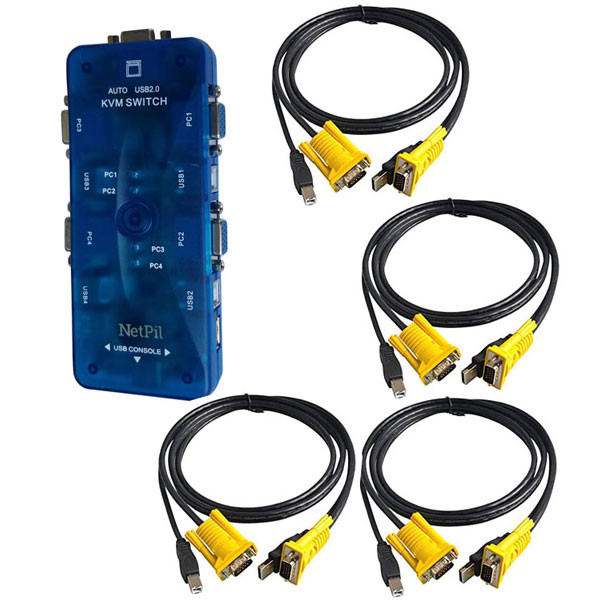 سویچ چهارپورت KVM نت پیل مدل 104UK-T به شما این امکان را میدهد که به آسانی چهار عدد کیس و کیبورد و ماوس وصل شده و به طور همزمان چهار عدد کامپیوتر را به صورت اتومات مدیریت کرده و از طریق کیبورد به هر کدام از کامپیوتر ها سویچ کرده و بدون تماس با سویچ به هر کدام از کیس ها وصل شوید. NETPIL 104UK-T از پورت یو اس بی برای ارتباط به ماوس و کبورد و پورت VGA برای ارتباط تصویر کمک میگیرد. چهار عدد کابل یواس بی KVM به همراه دستگاه درون پک میباشد .