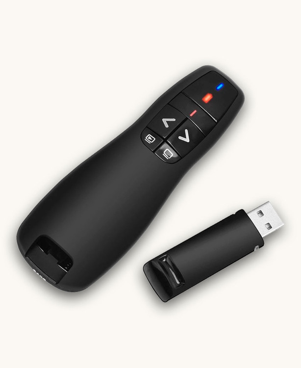 2. **پوینتر لیزری قرمز:** این دستگاه دارای یک پوینتر لیزری قرمز است که به کاربران کمک میکند تا نقاط مهم را در ارائههای خود برجسته کنند. این ویژگی به ویژه در اتاقهای تاریک بسیار مفید است.
